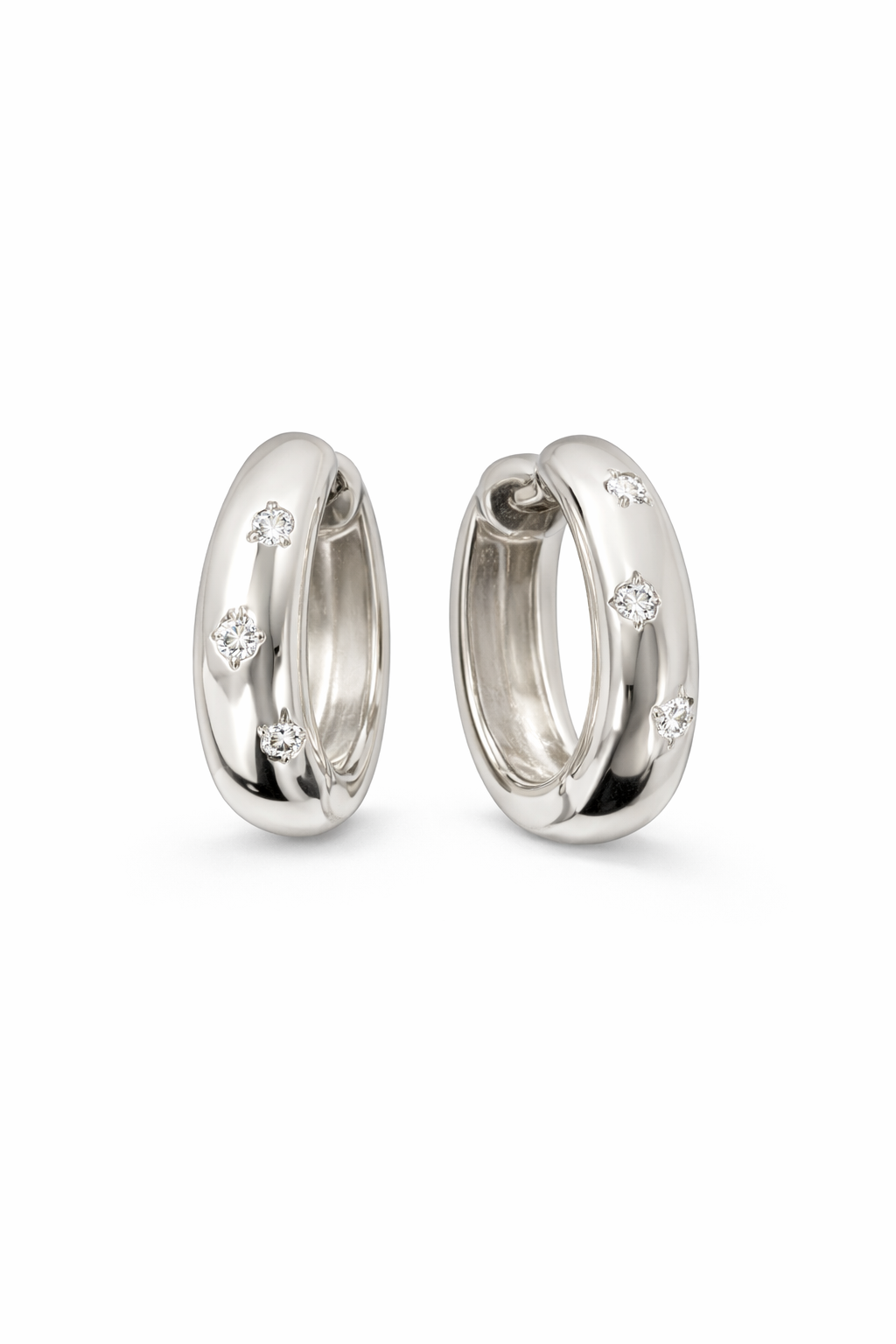 Coppia di orecchini con chiusura a scattino, ovale bombato nella pancia con qualche punto luce sparso, diametro interno 1 cm, altezza cerchio 1,5cm