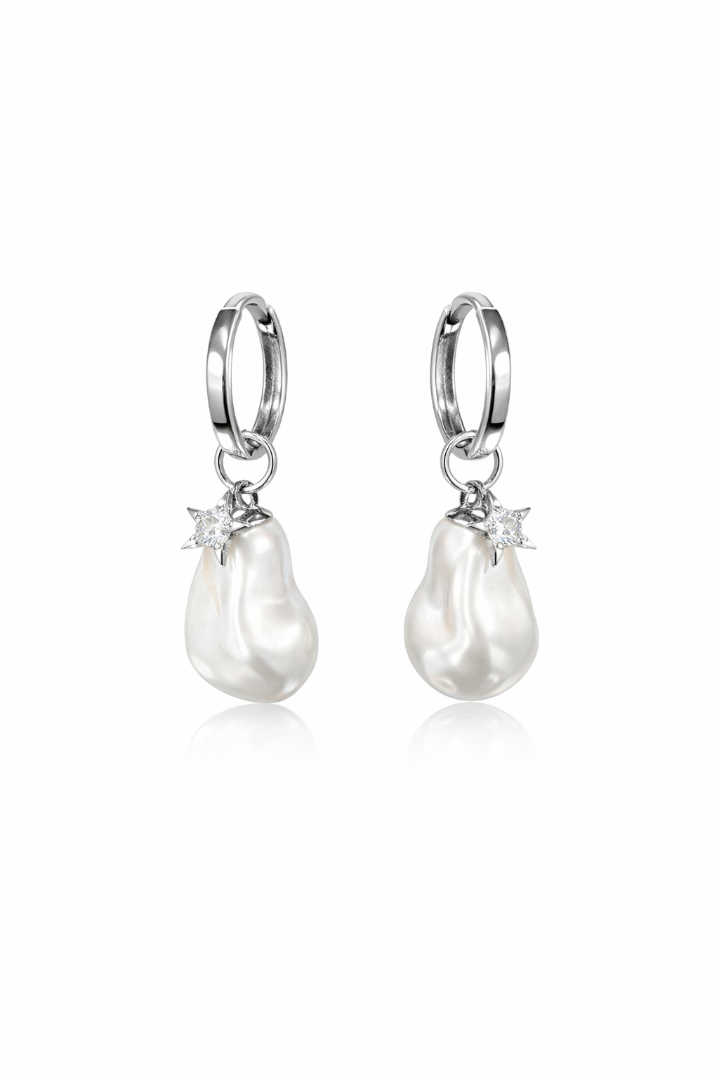 Coppia di orecchini a cerchio con chiusura a scattino, diametro cerchio interno 9mm, stella con zircone e perla sintetica barocca, altezza totale 3cm