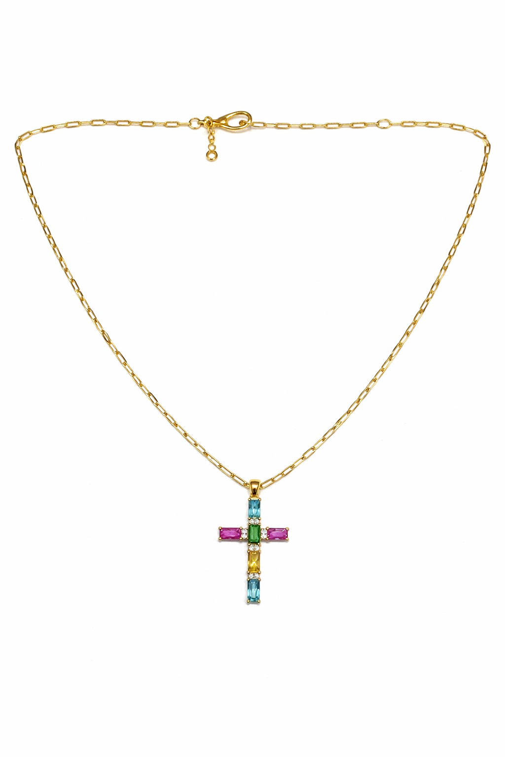 Collana con catena rettangolare e croce con zirconi colorati, altezza croce 3cm, lunghezza catena 45cm + allungo