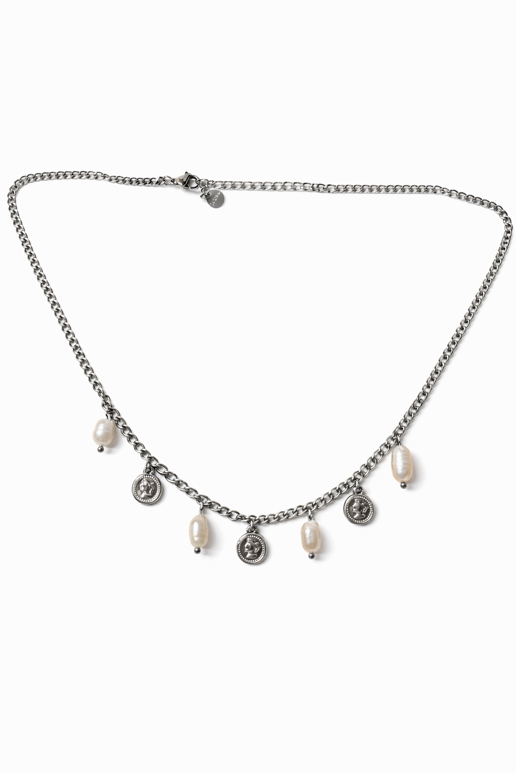 Collana con catena con maglia groumette, perle di fiume naturali pendenti e monetine, lunghezza 40c, + allungoMateriale.
