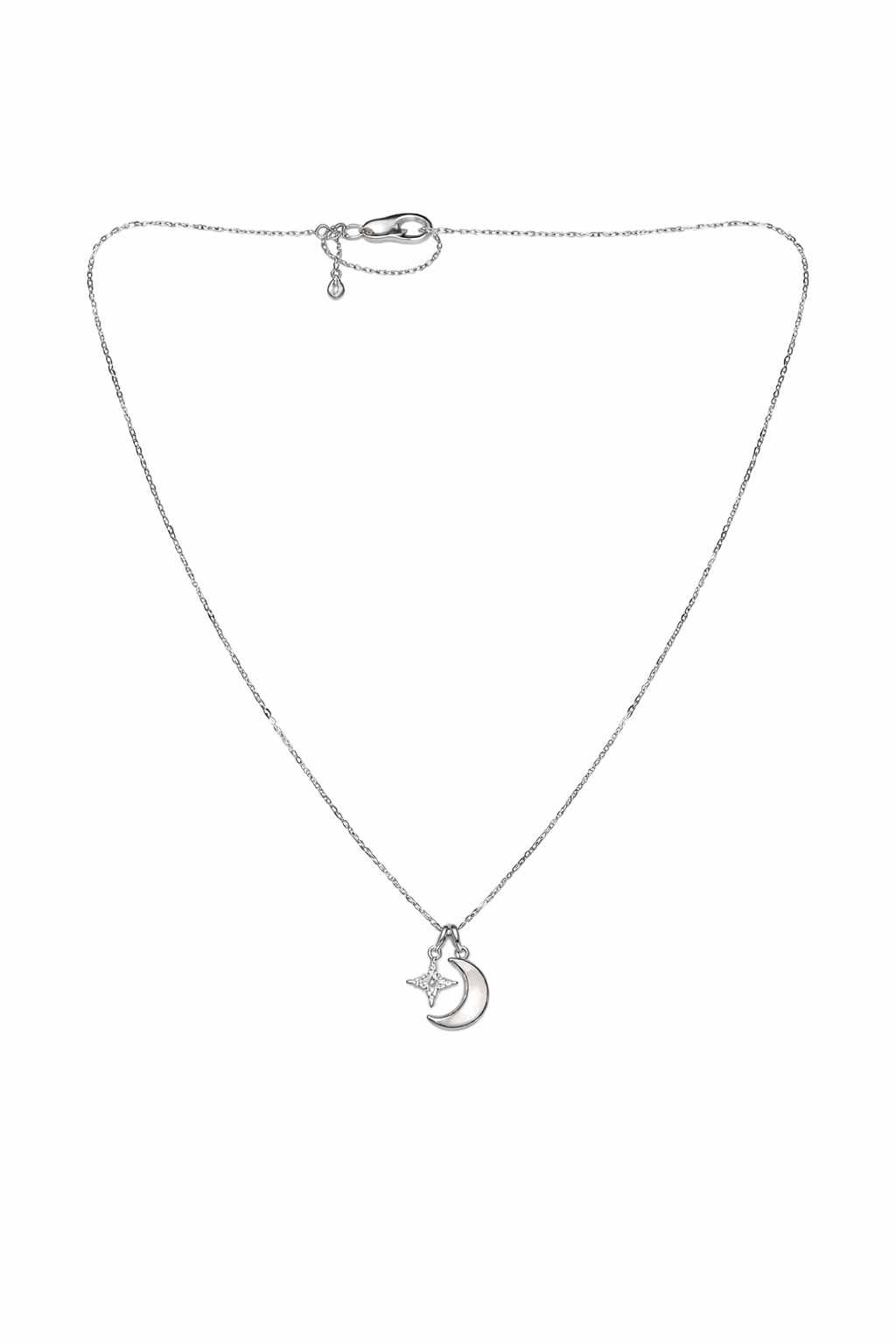 Collana con catena diamantata e mezza luna in madreperla e stella del mattino in zirconi bianchi, altezza luna 1cm, altezza stella 8mm,