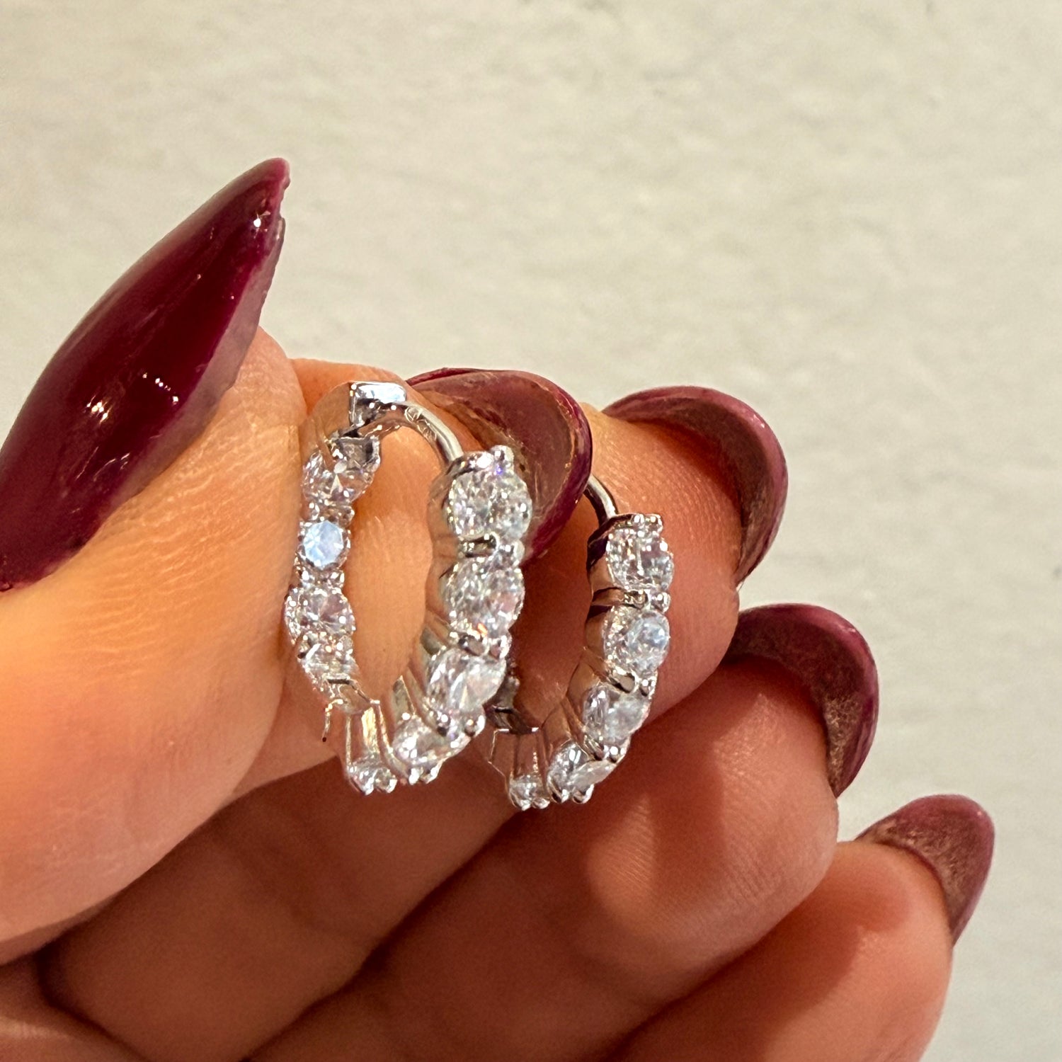 Coppia di Orecchini a cerchio con chiusura a scattino, unica misura, zirconi frontali e nel retro da 3mm, Luce favolosa