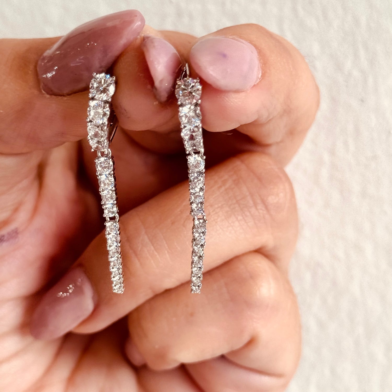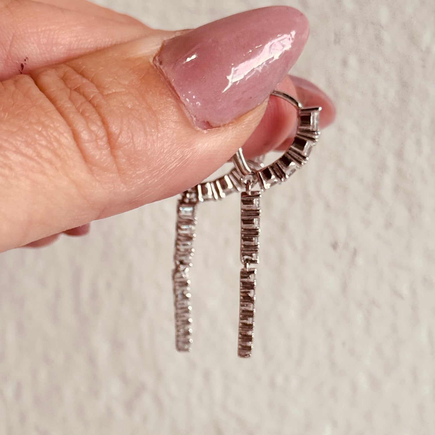 Coppia di orecchini a chiusura a scatto, forma triangola, diametro interno 9mm, con zirconi a grandezza a scalare, codina pendente lunga 2cm