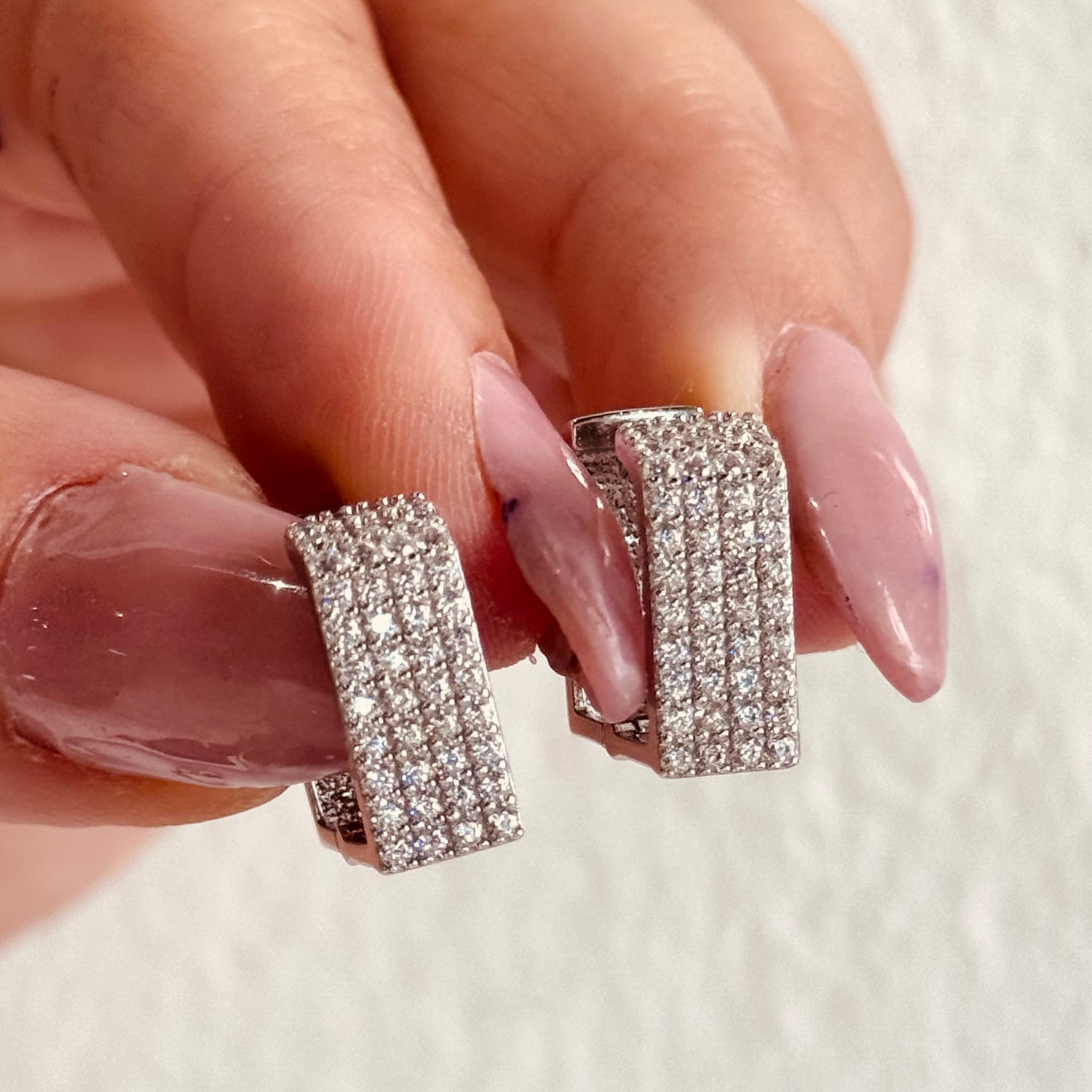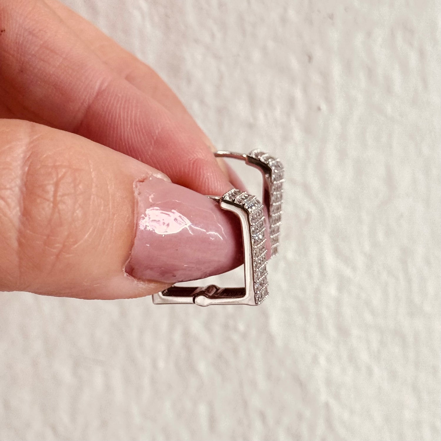 Coppia di orecchini a chiusura a scatto, forma quadrata , diametro interno 12mm, banda da 6mm di altezza, pavè di zirconi bianchi frontale, retro a specchio, da portare in entrambi i lati