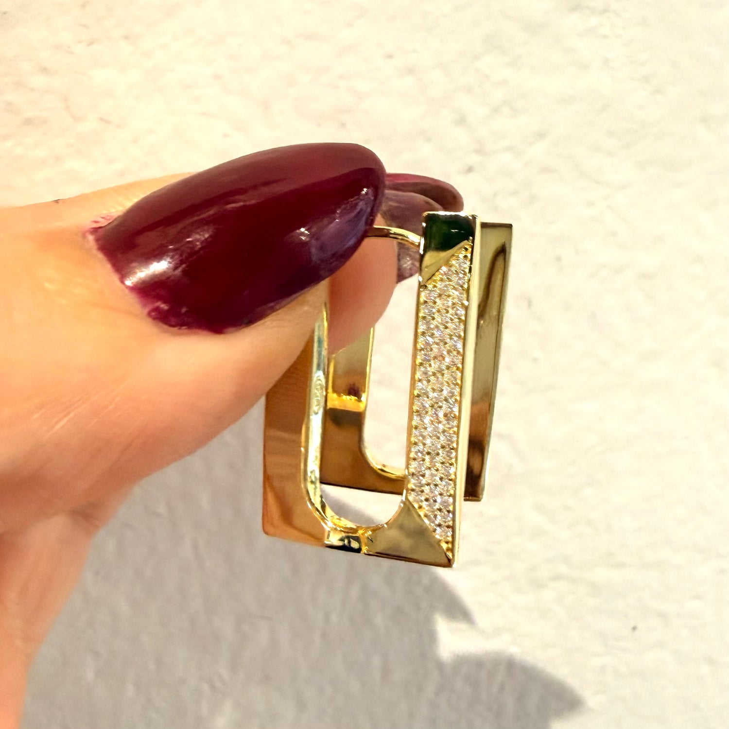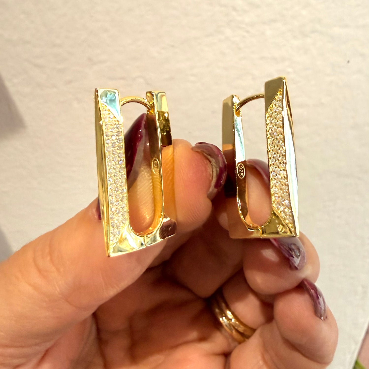 Coppia di orecchini , chiusura a scatto, altezza 2,5cm larghezza 1,5cm, piatti con pavè di zirconi laterali, super leggeri