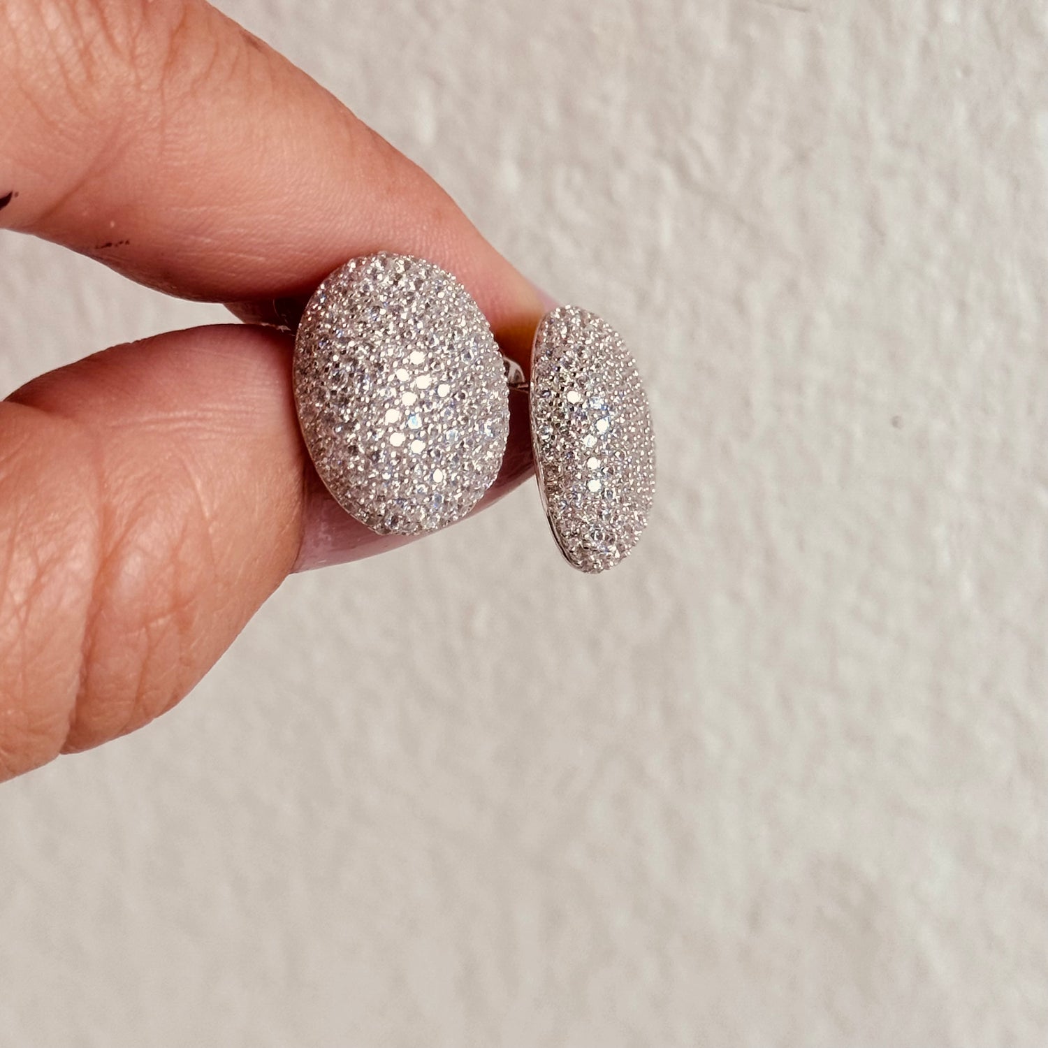 Coppia di orecchini con perno e farfallina a 5mm dall’estremità in modo da consentire di coprire completamente il vostro foro, retro piatto, un pavè incredibile frontalmente. Grandezza del confetto 1,5cm di larghezza e 1,7 di altezza