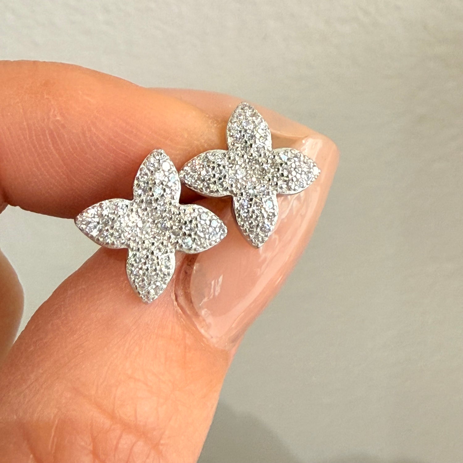 Coppia di orecchini a fiore in pavè, diametro 1cm, perno centrale.