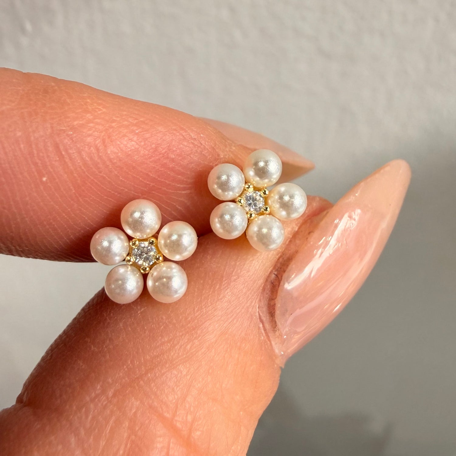 Coppia di orecchini Diametro 8mm, fiore con petali in perline sintetiche e pistillo zircone bianco