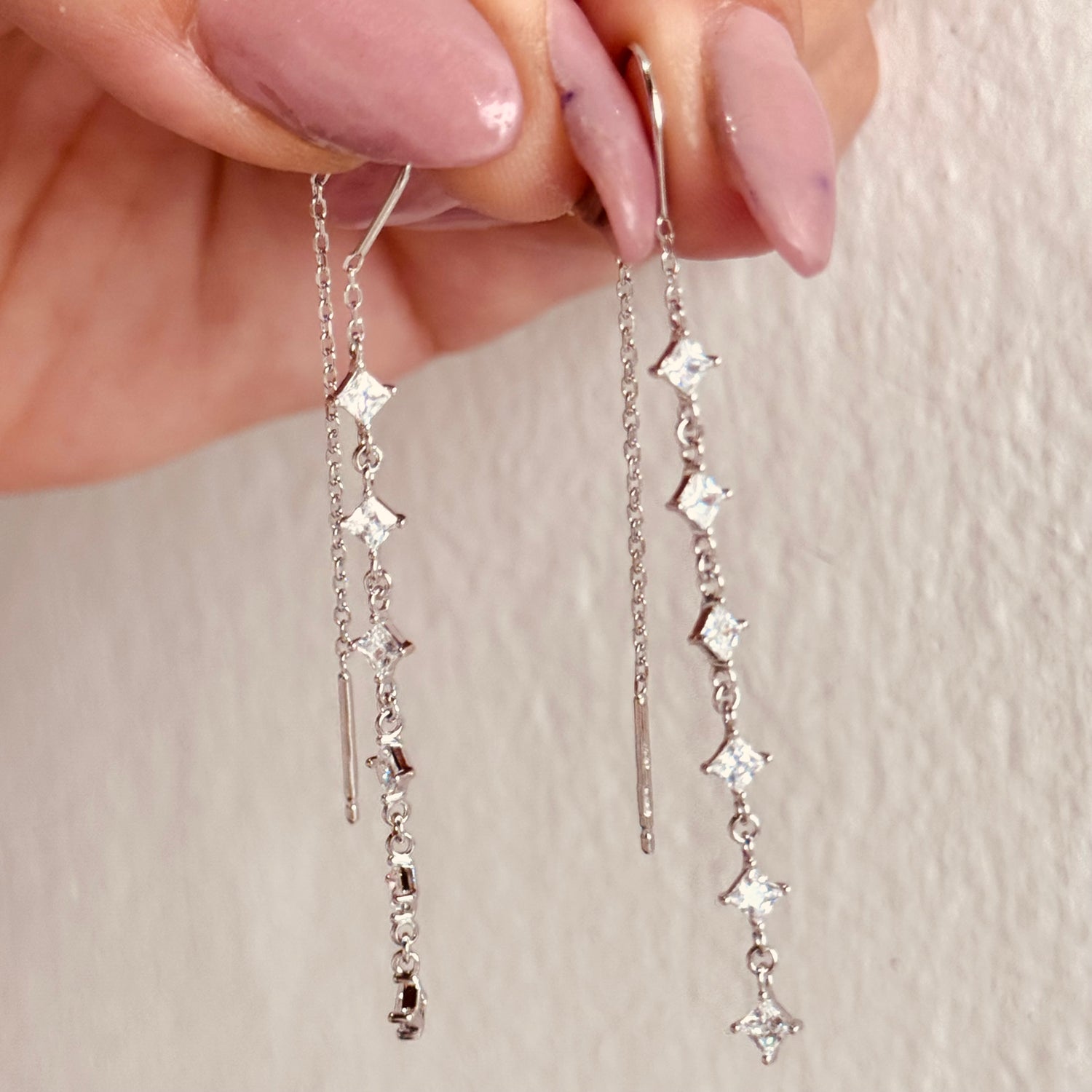 Coppia di orecchini Sali e Scendi, che consistono in orecchini ad infilo tramite un bastoncino, una catena che deve scorrere all’interno del lobo fino alla posizione della curva frontalmente una catenella di punti luce taglio carrè bianchi